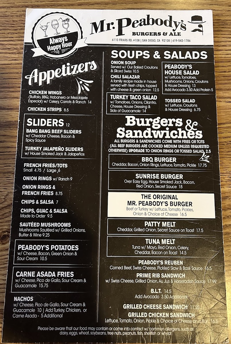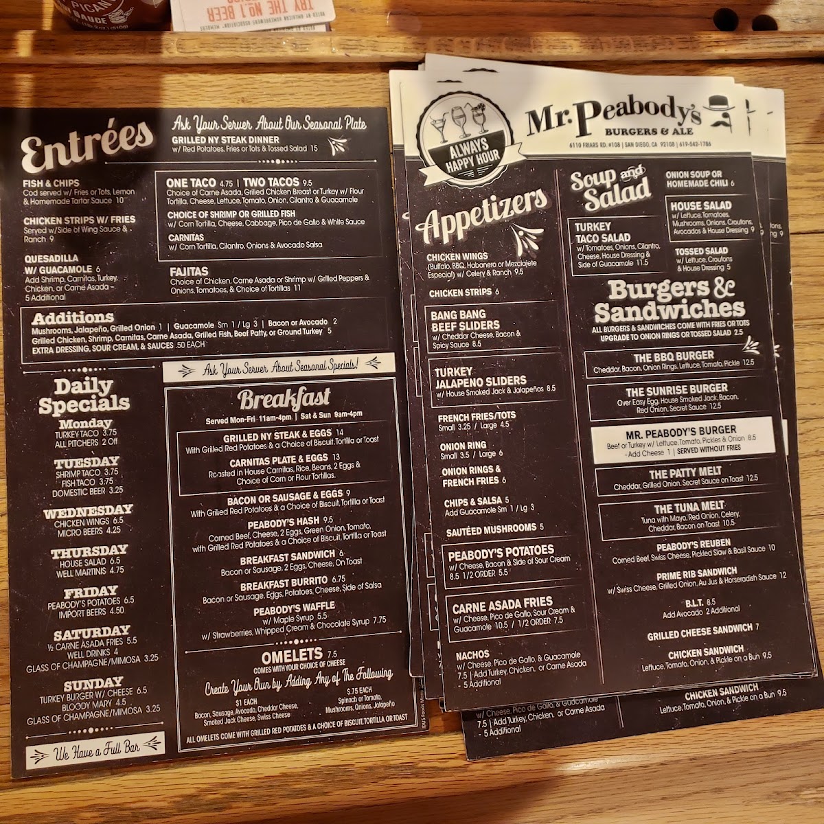Welcome to Mr. Peabody's Burgers & Ale, where every bite tells a story and every sip creates a connection. Nestled in San Diego, this eatery combines comfort food with a delightful atmosphere. The menu features a variety of mouthwatering appetizers, including crispy chicken wings and golden onion rings. Main highlights are their signature burgers—especially the sunrise turkey burger, praised for its tender patty and rich flavors.